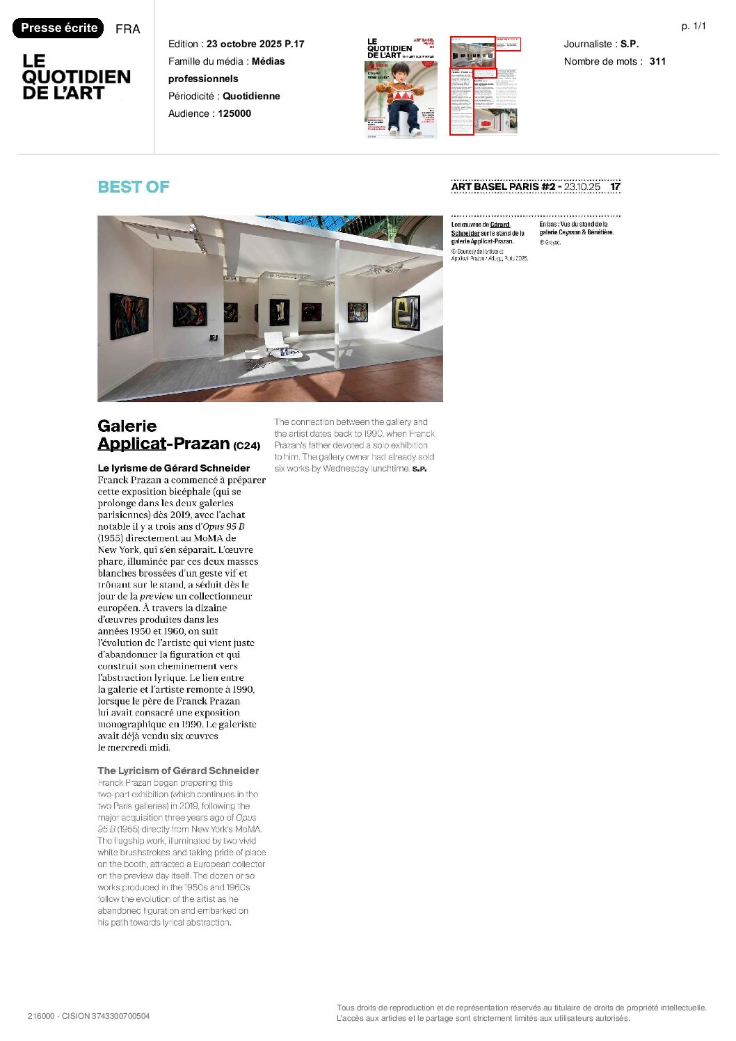 A l’occasion de sa première participation à Art Basel Galleries du 16 au 19 juin 2016, Applicat-Prazan a présenté quatre peintures muséales parmi une sélection d’œuvres exceptionnelles de l’Après-Guerre européenne.