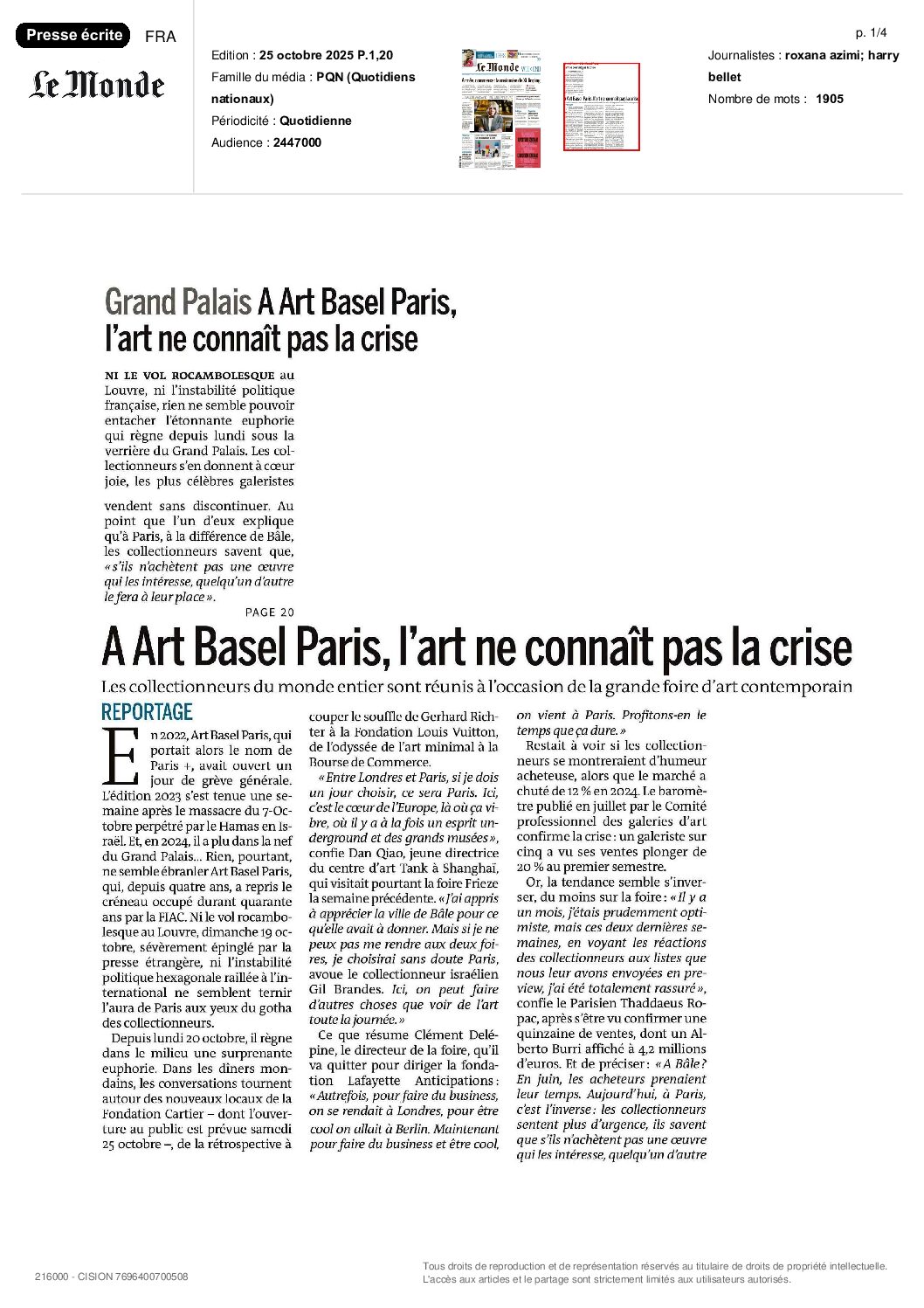 À l’occasion de sa participation à Art Basel du 13 au 16 juin 2019, Applicat-Prazan a présenté une exposition intitulée BBB Bold | Brilliant | Big